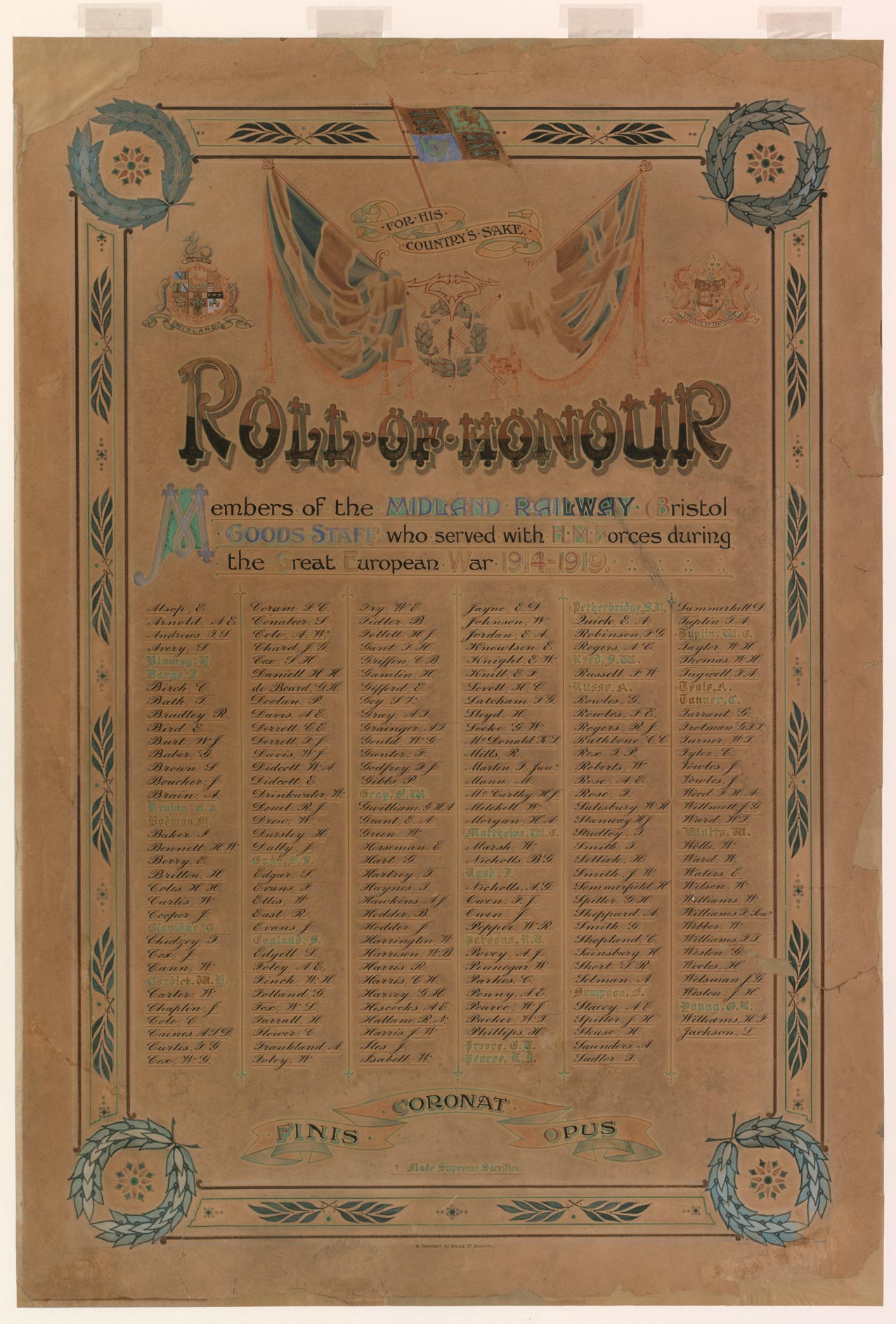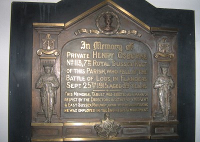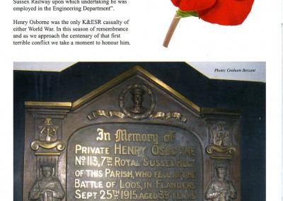 In the First World War somewhere between 20,000 and 30,000 railwaymen died, and they are honoured in a series of war memorials. Most of the companies that existed at that time created memorials for their staff, varying from the grand Lutyens memorials of the Midland Railway in Derby and the North Eastern Railway in York to a simple plaque in Salehurst church commemorating the single member of the staff of the Kent & East Sussex Railway who was killed in the Battle of Loos in 1915. In addition to these there were many local memorials paid for by local staff, and some railways, noticeably the Great Western, created Rolls of Honour, recording all their staff who fell in the war, which were placed in major stations around the system.